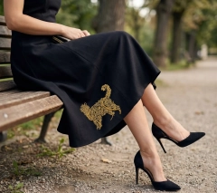 #SkirtEmbroidery #EmbroideredFashion #GoldEmbroidery #MachineEmbroidery #CatEmbroidery #WearableEmbroidery #BlackDressStyle -