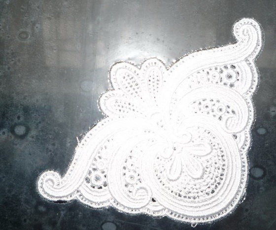 I decided to use water-soluble stabilizer for the second design, the most open-worked of all three, considering it to be the flimsiest. It stretched well in one direction, which I didn't at all like, and I thought that there would be shifting.