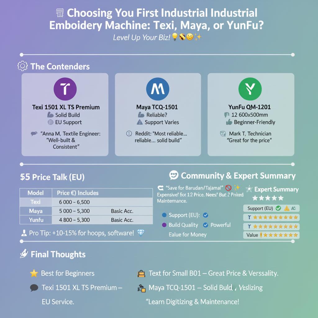 🧵 Choosing Your First Industrial Embroidery Machine: Texi, Maya, or YunFu?