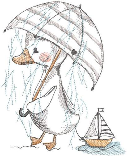 Bring a smile to your stitching projects with this cute duckling walking under an umbrella! The delicate sketch-style lines and soft pastel colors make this embroidery design perfect for children’s accessories, tote bags, or nursery decor. The little boat adds a whimsical touch of storytelling charm.