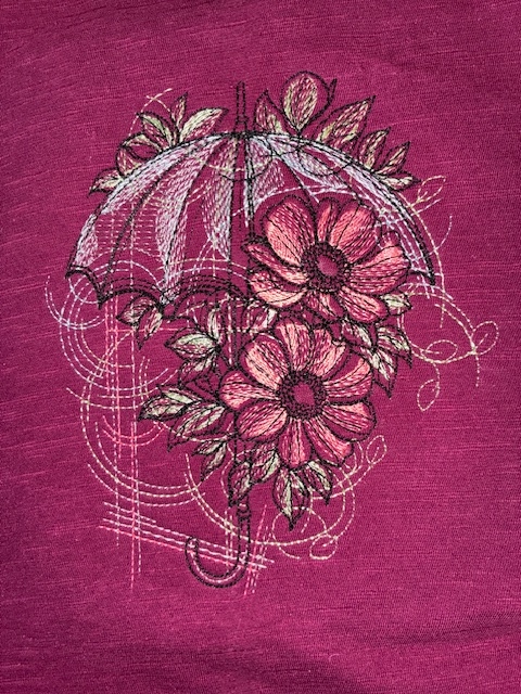 This design is gorgeous! As a wanna-be digitizer, it was totally intriguing to watch the whole thing stitch out with NO jump stitches! The ONLY thing I would like to suggest to anyone who makes this is to use it on a white or light background because, in real life (although not so much in the picture I took of it), using it on a darker color makes it hard to see the umbrella. I even tried using my sewing machine with gold metallic thread in it and carefully stitched over the umbrella parts, and that didn't really help either. On the other hand, using it like I did makes it look like the flowers have multiple colors, which they don't - it's the different stitch densities that do that! Thank you SO much!