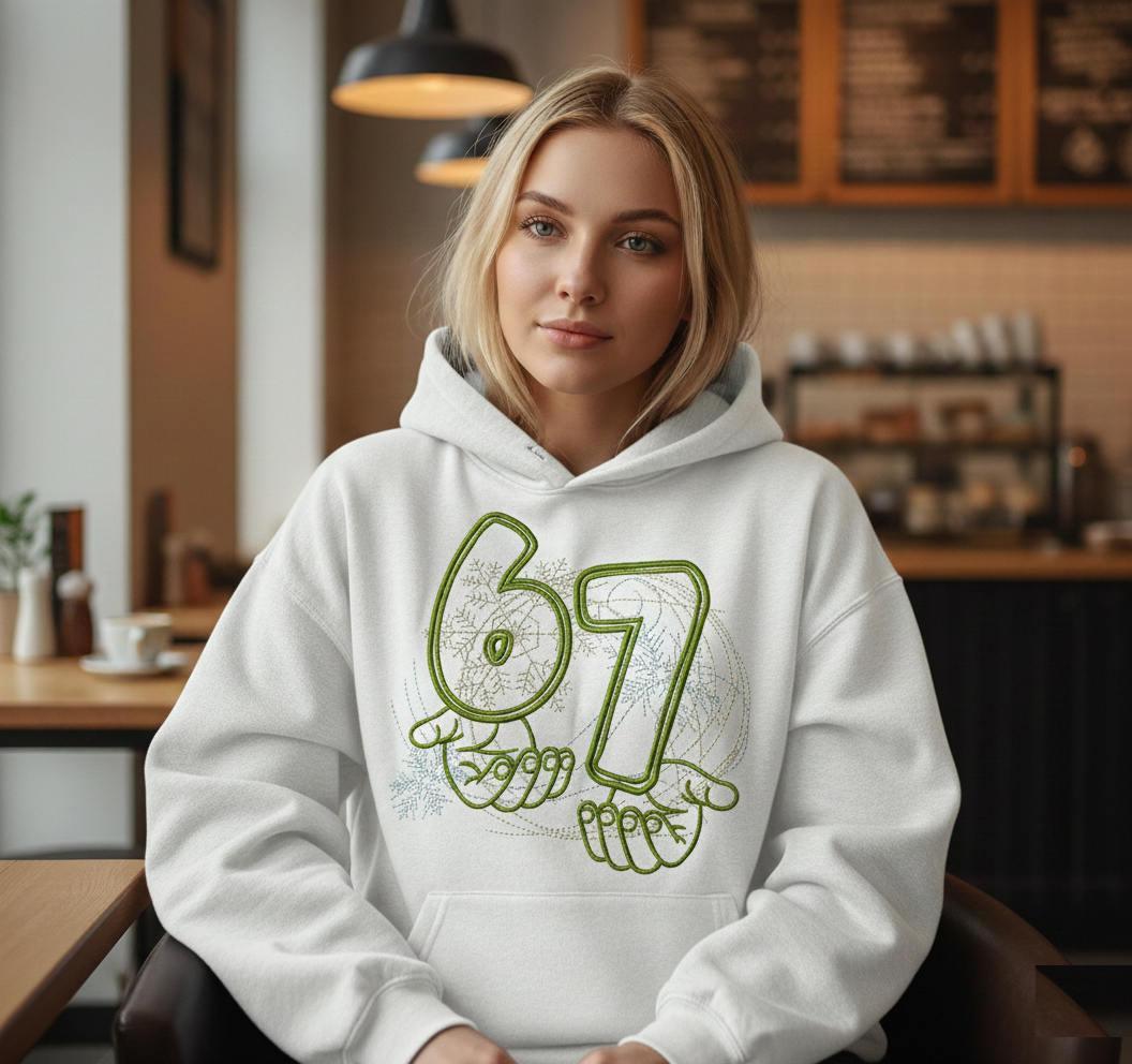 On hoodies, “67” becomes a badge of internet awareness, not just decoration.