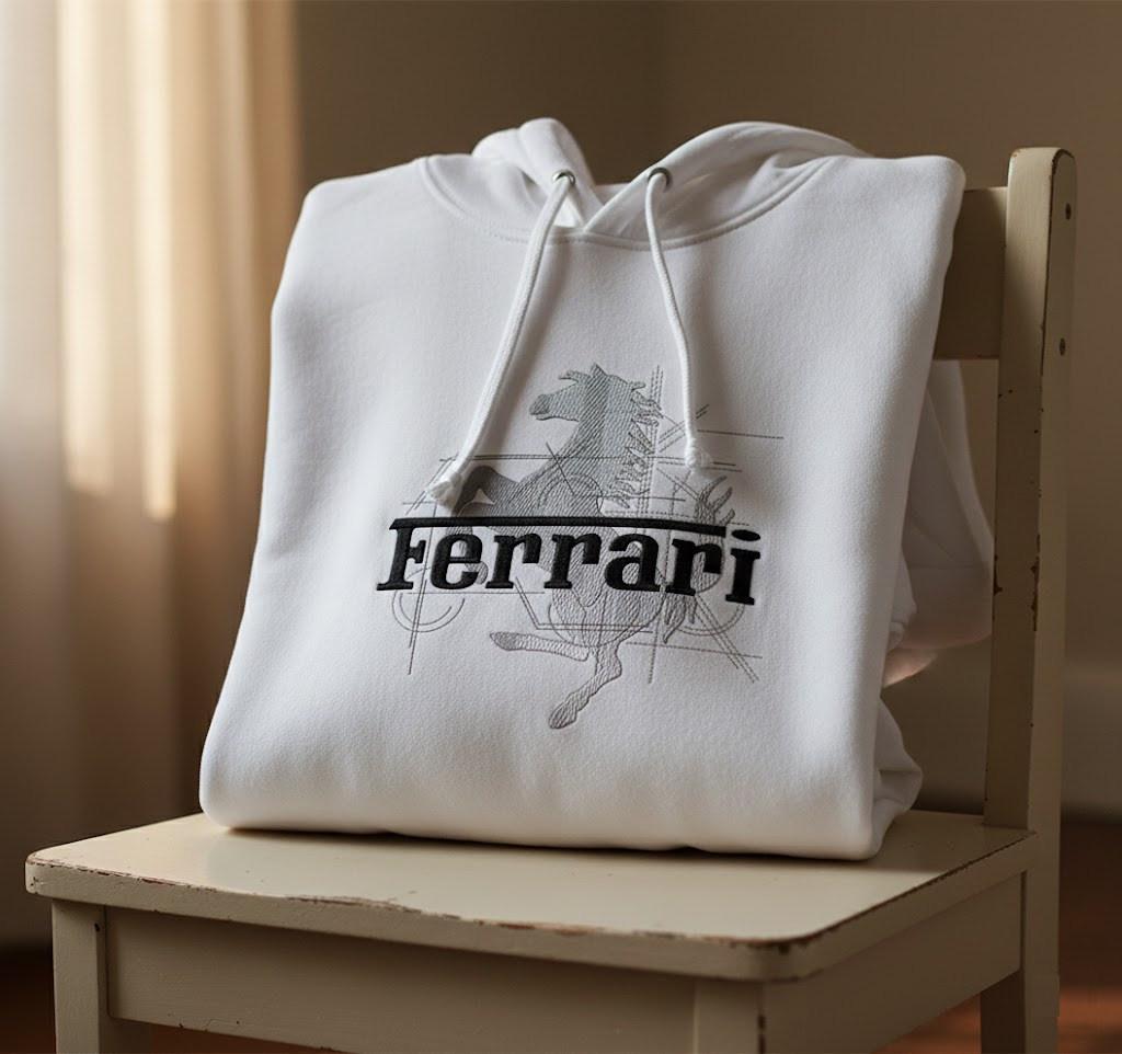 Example: the Ferrari modern logo embroidery design uses a horse silhouette and clean type — perfect for hoodies, because it keeps the brand recognizable even at medium size.