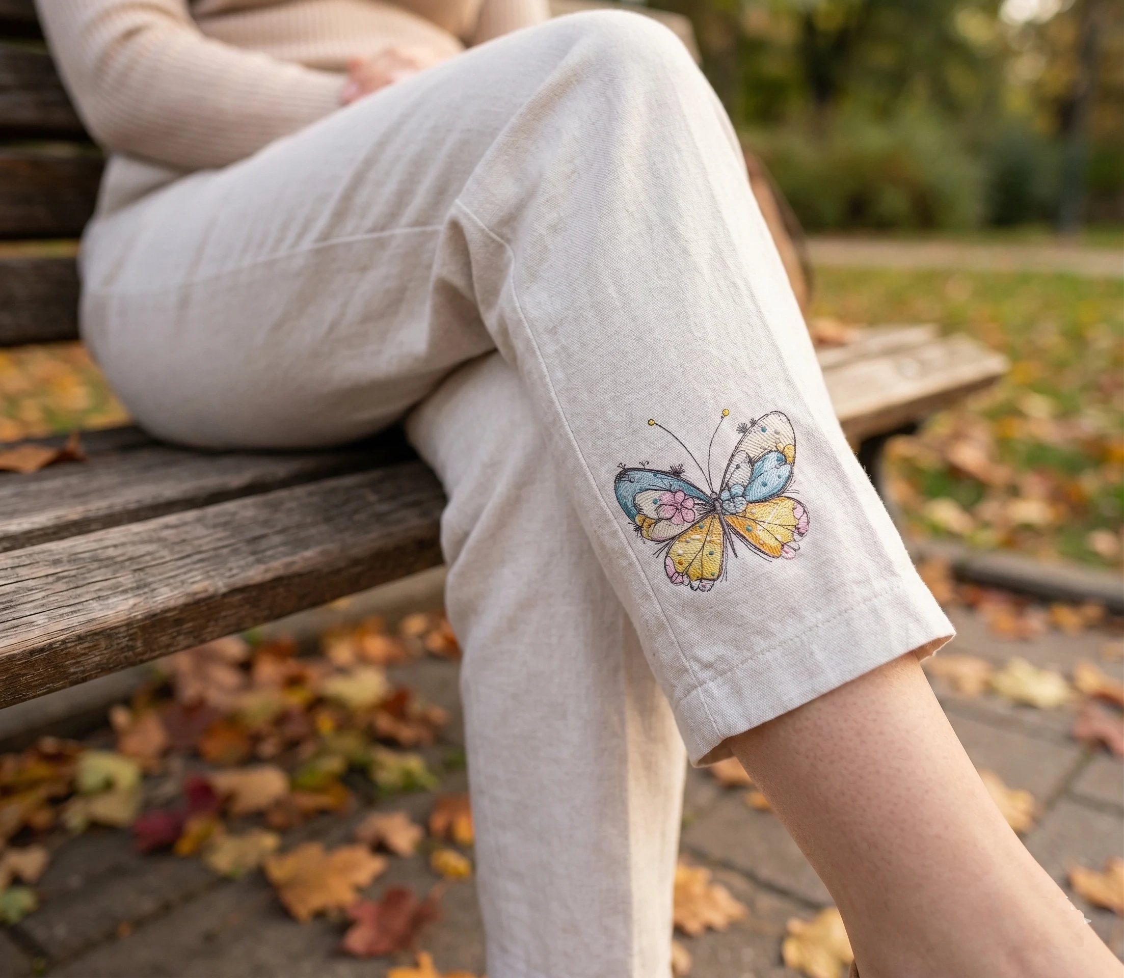 Pants are one of the trickiest garments to embroider on. Unlike a flat pillowcase or a jacket back, trouser fabric curves, stretches, seams appear at the worst moments, and the leg tube doesn't fit neatly into any standard hoop. But the result โ a butterfly catching light on cream linen while you sit in an autumn park โ is absolutely worth mastering the technique.