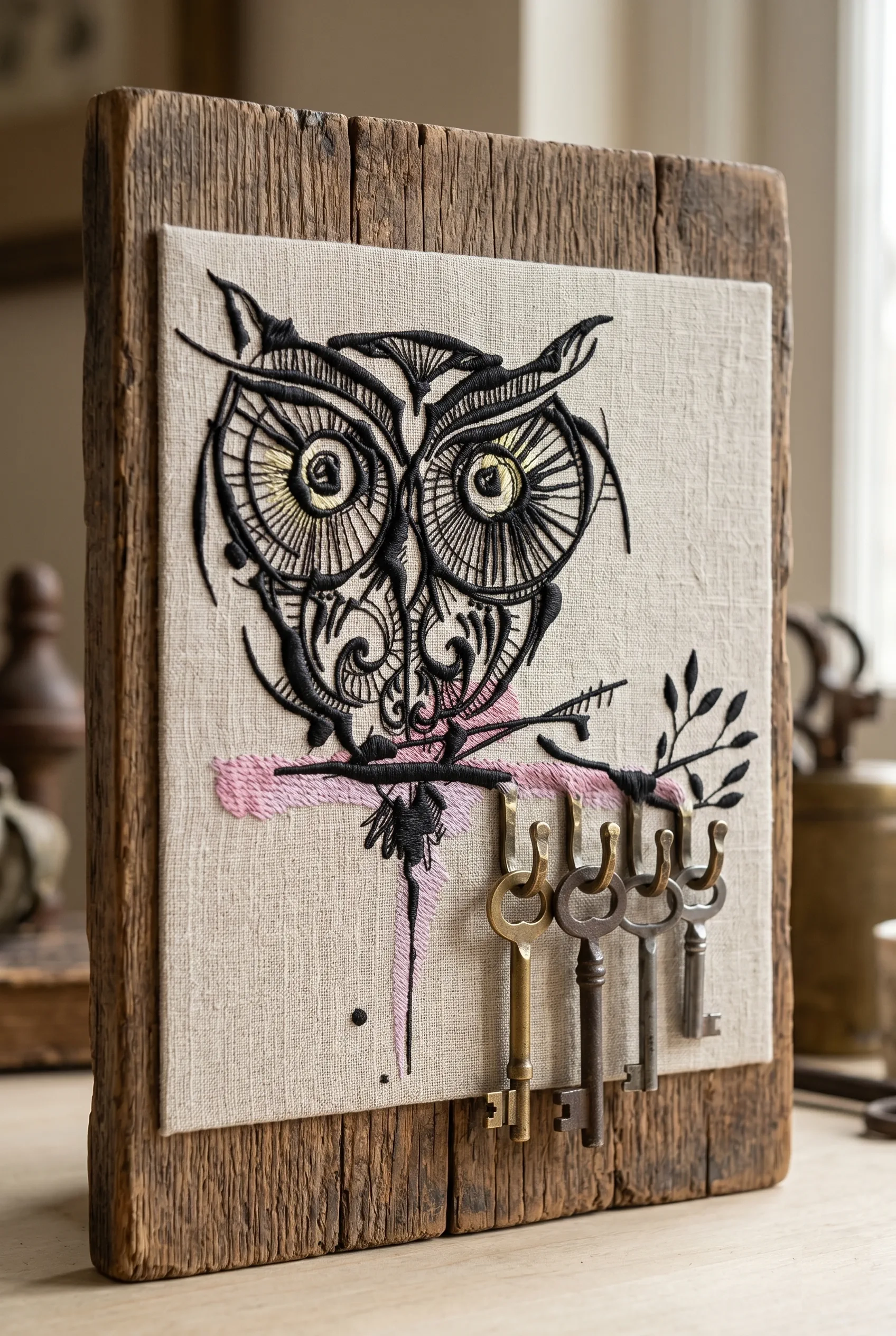 This key holder was made with a single linen panel, an oak frame, copper screws — and no sewing at all. The embroidered owl is mounted with double-sided adhesive tape, stretched smooth, secured from the back. Clean, professional, permanent.
