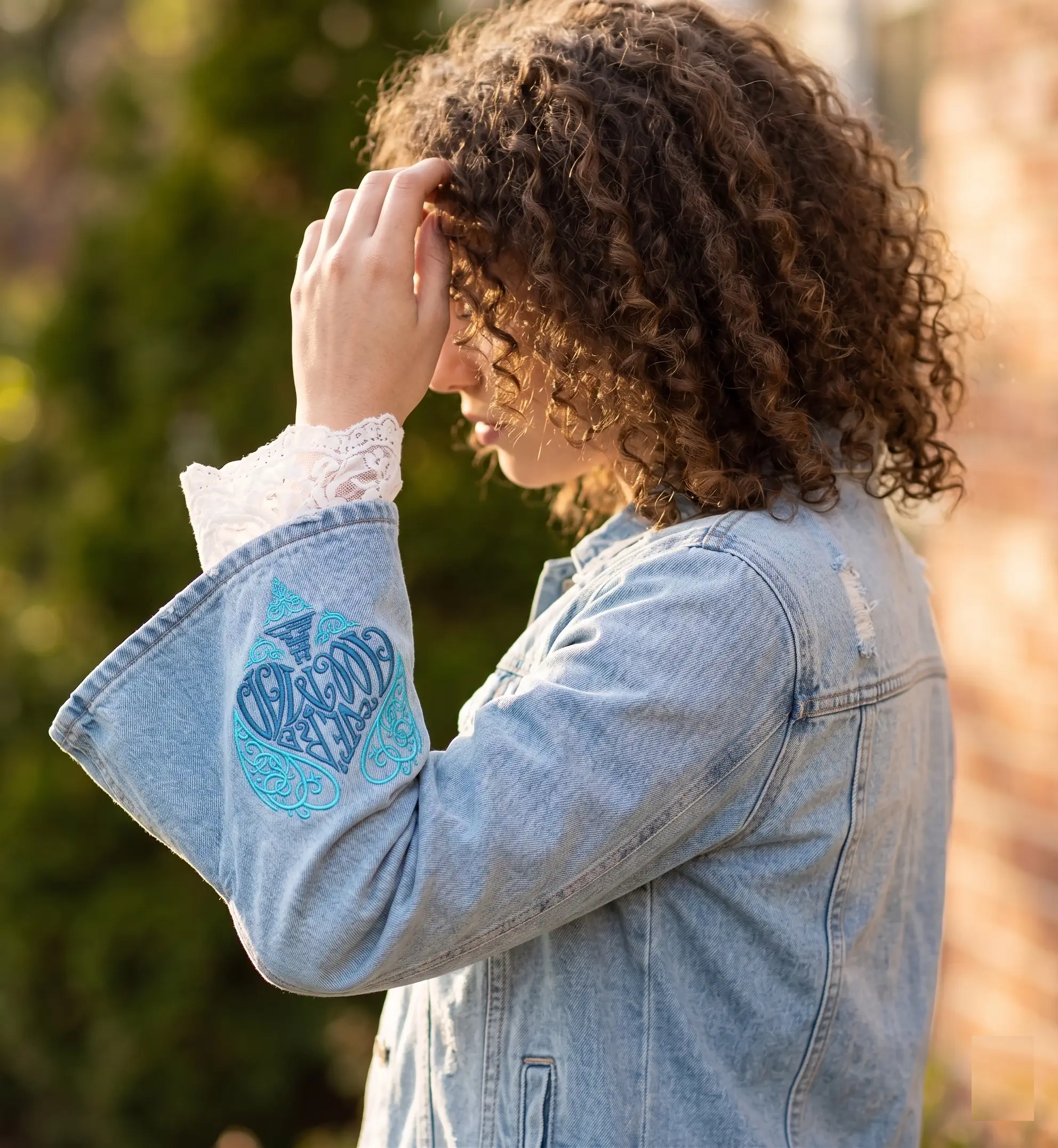 Light-wash and mid-wash denim are the most forgiving sleeves to work on — and the most photogenic. Blues and teals read as tonal elegance. Warm terracottas and rusts create striking contrast. White and ivory feel vintage and considered. The one colour to avoid on light denim: pale grey — it disappears.